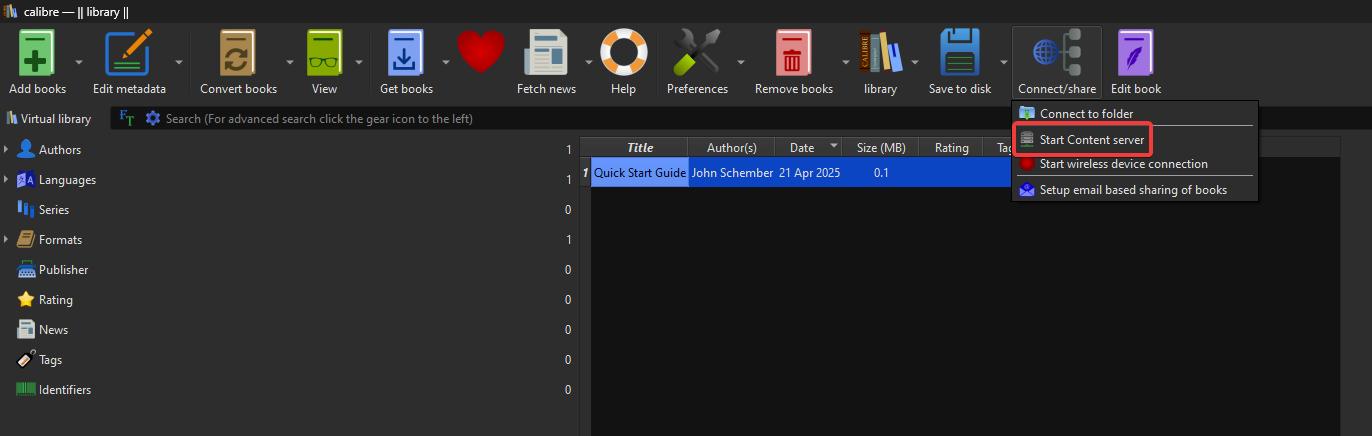 If you click Connect/share again, you'll see Stop Content server [..., port ... HTTP]. This is the IP and the port where the Calibre server is being hosted.