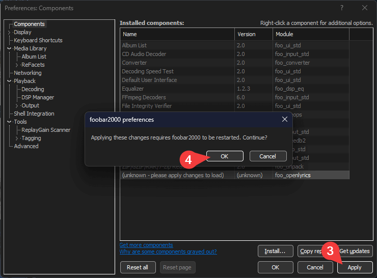Select the downloaded OpenLyrics component file and open. Then click Apply to load it and OK to restart the app.