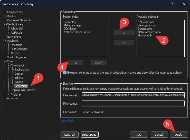 Tools > OpenLyrics > Searching. Click on Musixmatch in Available sources. Then << to move it in the main section. Then select Musixmatch again and click UP to the top 3. Click Apply.