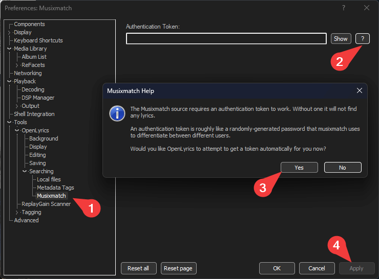Tools > OpenLyrics > Searching > Musixmatch. Click ? and then Yes. Hit Apply.