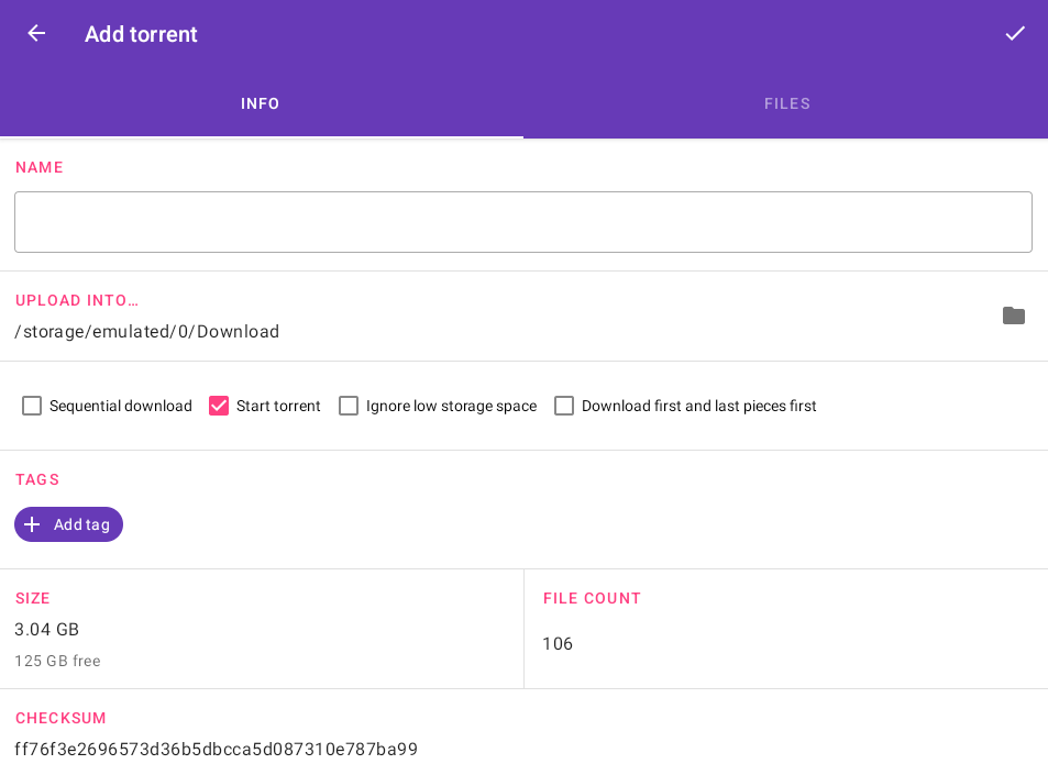 - It will open a pop-up window in LibreTorrent. It will show file count and download location. After adjusting everything, click "".