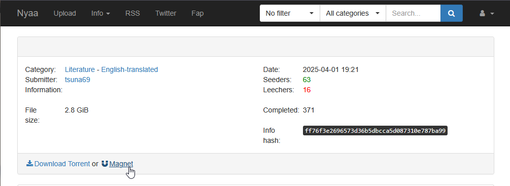 For this guide, we will use qBittorrent v5.0.1 and download files from Nyaa. Other clients should work in a similar manner, with minor UI changes.