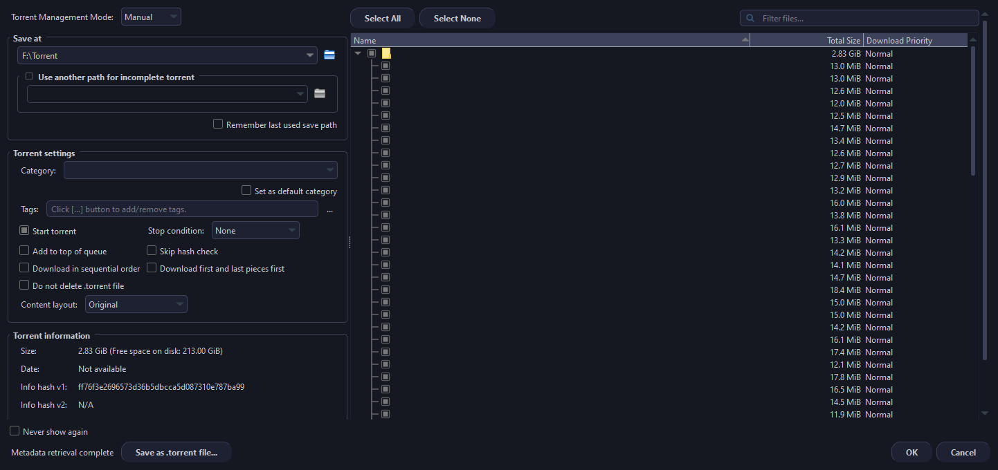 - It will open a pop-up window in qBittorrent. Client will retrieve all the metadata and then show all the files and folders, where to download them, and other settings. After adjusting everything, click OK.