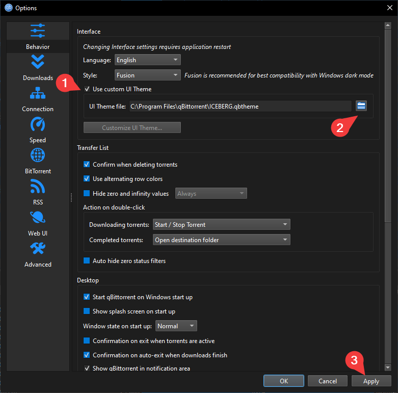 Default dark mode of qBittorrent is just too ugly. So we are using a custom theme, Iceberg.